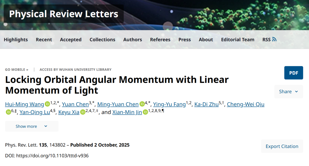Hui-Ming Wang, et al. "Locking Orbital Angular Momentum with Linear Momentum of Light." Phys. Rev. Lett. 135, 143802