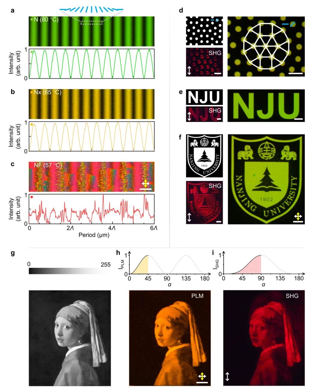 研究团队通过理论模拟阐明,“挠曲电效应”与“极性朗道能”之间的微妙竞争,主导了这种奇特单极性拓扑结构的形成,成功解释了无缺陷极性序构的形成机理,为实验观察提供了可靠的理论依据。得益于该中间相的特性,团队提出“流体铁电畴工程”,利用先进的光控取向技术,成功实现了大面积的、无缺陷、精确可控的复杂极性图案制备。无论是预设的准晶格、南大校徽,还是世界名画《戴珍珠耳环的少女》,都能被高保真地“印制”在液晶序构中,并可通过非线性光学成像清晰显现。