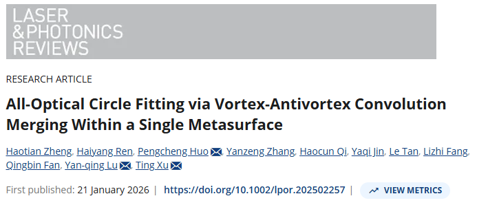 研究成果以题为:《All-Optical Circle Fitting via Vortex-Antivortex Convolution Merging Within a Single Metasurface》发表于期刊《Laser & Photonics Reviews》。单位为:南京大学,第一作者为:南京大学Haotian Zheng。通讯作者为:南京大学Pengcheng Huo、陆延青、徐挺教授。